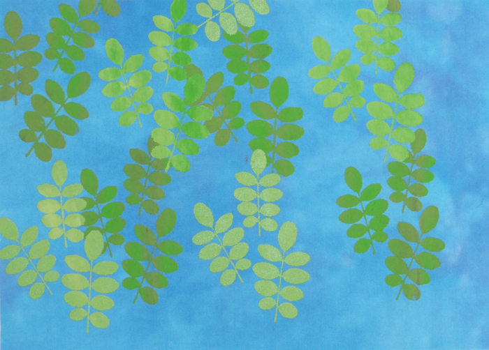 | A small hand dyed and screen printed piece (about 7"x10"), seen in my inspiration photo on Virginia's blog. The locust leaves are one of my signature design elements |